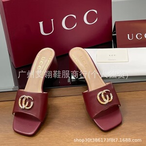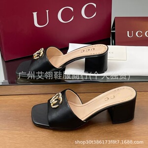 跨境外贸G家雪花扣水钻字母搭扣圆头一字拖鞋低跟平跟真皮凉拖鞋g