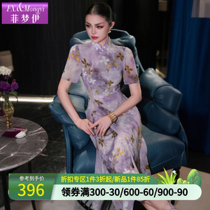 Feimengyi パープルプリント新中国ドレス女性の夏の国民風スタンドカラースリムプリーツ改良されたチャイナドレス
