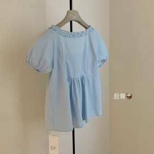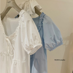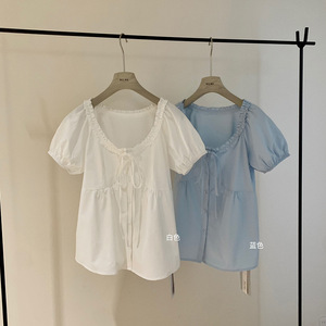 WGWE6259 ウッドエッジレースアップUネックパフスリーブシャツ夏ルーズシャツプチベビードールシャツトップ