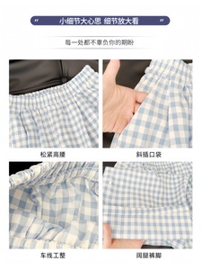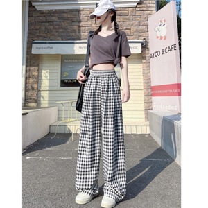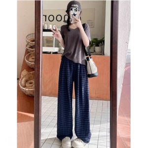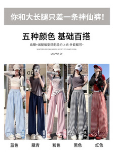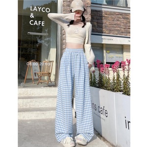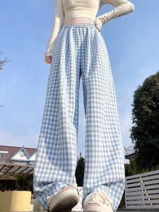 ブルーチェック柄パンツレディース人気2025年夏新作ハイウエストルーズスリムカジュアルパンツストレートワイドレッグスポーツパンツ