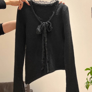 韩系简约气质通勤修身蕾丝边系带长袖打底设计感上衣休闲甜美小众