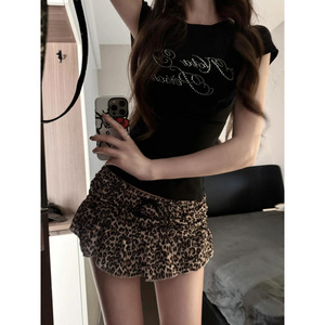 甜辣风小众烫钻短袖T恤套装女夏季辣妹豹纹半身裙修身显瘦上衣ins