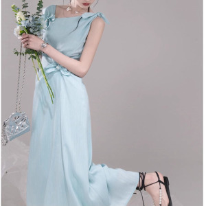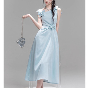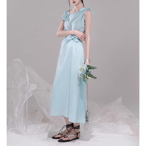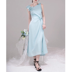 クールな女の子の水出しブルーの非対称ツイストウエストノースリーブドレス