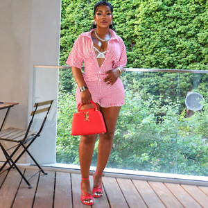 ヨーロッパとアメリカのクロスボーダー婦人服 2025 夏の新ファッションラペルウエストチェック柄シャツハイウエストショーツカジュアルスーツ