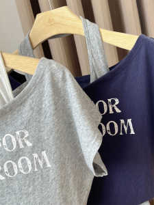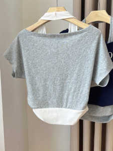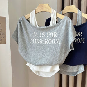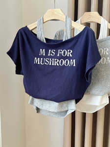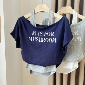 アメリカンレトロレタープリント半袖Tシャツレディース夏新作プリーツウエストフェイクツーピースホルターネックオフショルダートップ