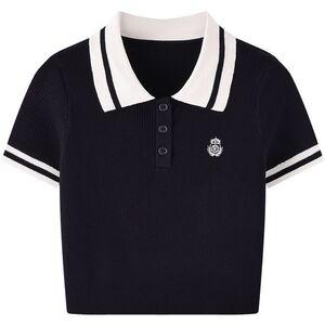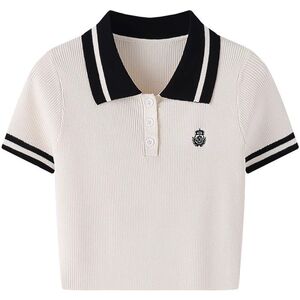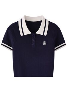 バッジ刺繍カレッジスタイルカラーラペルニット半袖レディース夏新作スリムショートTシャツトップ
