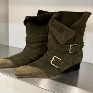 牛皮~绒面复古方头两穿翻折粗跟皮带扣中筒靴女秋冬季马丁靴短靴