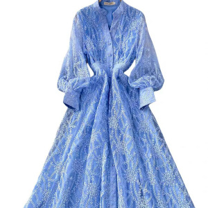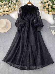 フレンチレトロエレガントドレス女性のための 2025 新しいハイエンドスタンドカラーシングルブレストウエスト刺繍メッシュロングスカート