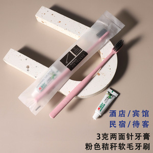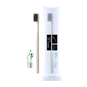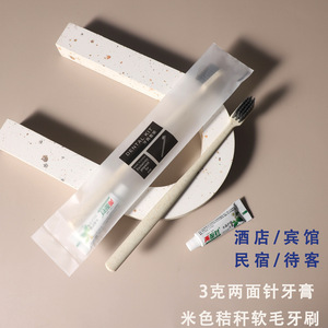 ベージュのストローの柔らかい毛の歯ブラシ + 両面針歯磨き粉 3 グラム