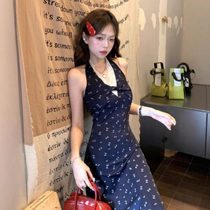 蓝色挂脖吊带碎花连衣裙子女夏季2025年新款法式气质无袖露背长裙