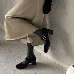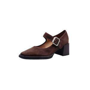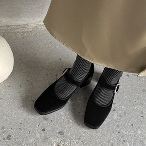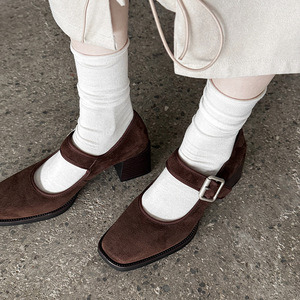 サイレントボトムヘップバーンスタイルメリージェーンシープスエード2025秋厚いハイヒールスクエアトゥベルトバックル本革靴女性用