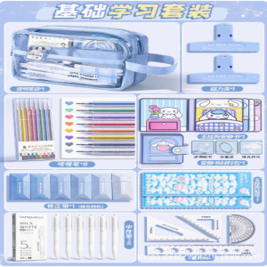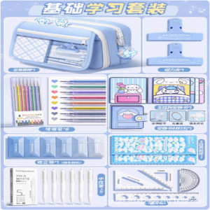 [新学期ギフトパック] スカイブルー透明ペンケース 1 + 定規セット 1 シナモンドッグステッカー 1 + 電卓 1 ペンホルダー 1 A5 ルーズリーフブック 1 シナモンドッグクワイエットブック 1 マグネットクリップ