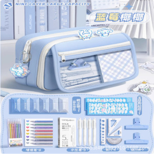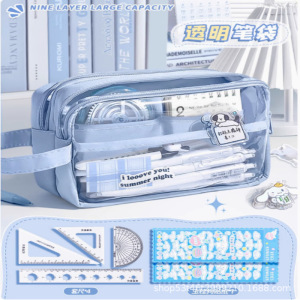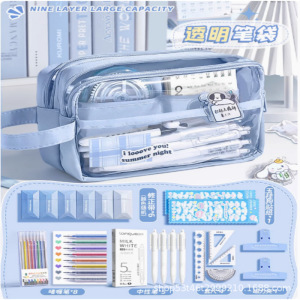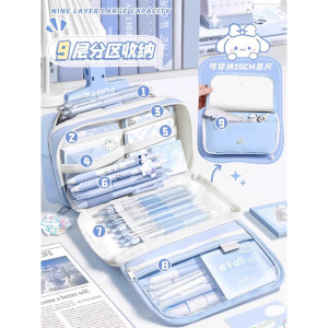 9層スカイブルーペンケース/定規+ステッカー+マグネットクリップ+アカウントペン+修正テープ+ゲルペンのセット付き