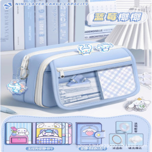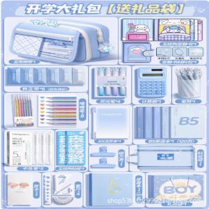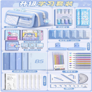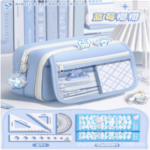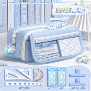 [新学期ギフトパック] スカイブルー 9 層ペンケース 1 + 定規セット 1 シナモンドッグステッカー 1 + 電卓 1 ペンホルダー 1 A5 ルーズリーフブック 1 シナモンドッグクワイエットブック 1 マグネット