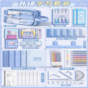 スカイブルー 5 層ペンケース/定規 + ステッカー + マグネットクリップ + アカウントペン + 修正テープ + ゲルペンのセット
