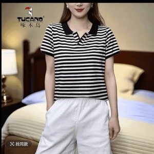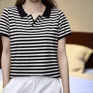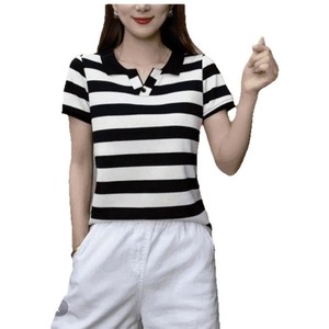 ドロップシッピングライブブロードキャストホットスタイル2025夏の新ファッションカラーブロックラペルストライプ外国風多用途半袖Tシャツ