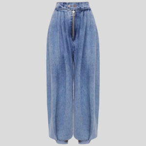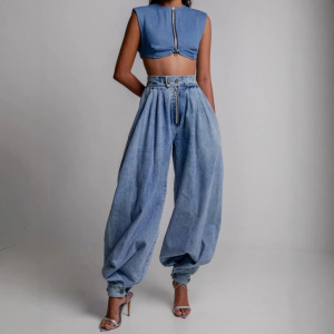 欧美跨境亚马逊气球裤高腰拉链束脚蓝色水洗牛仔裤宽松长裤女