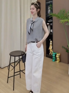 韩版翻领丝巾系带无袖针织背心女夏季设计感时尚减龄薄款百搭上衣