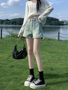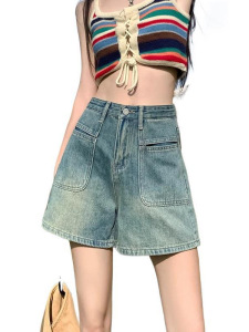 蓝色复古高腰牛仔短裤女2025年夏季新款宽松显瘦薄款a字阔腿热裤