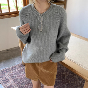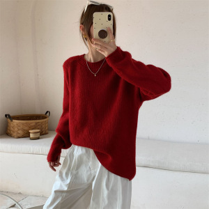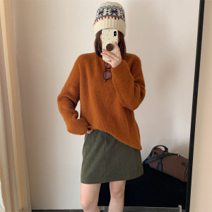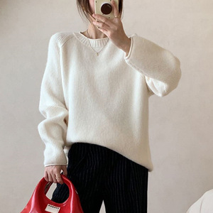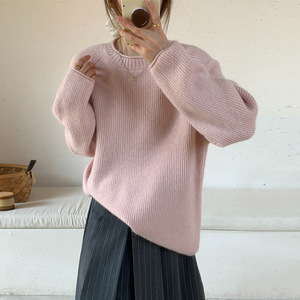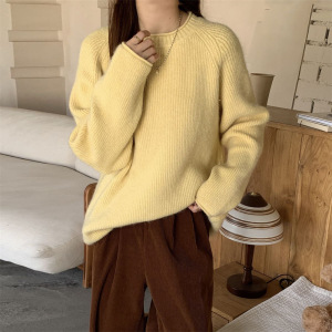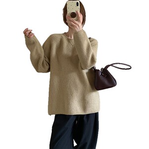 慵懒卷边套头毛衣女秋冬新款韩版宽松圆领显瘦温柔软糯针织衫上衣