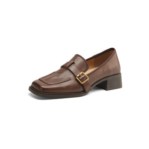 英国風ウォッシュド牛革ローファー2025秋厚中ヒールスクエアトゥベルトバックル本革深口シングルシューズ女性用