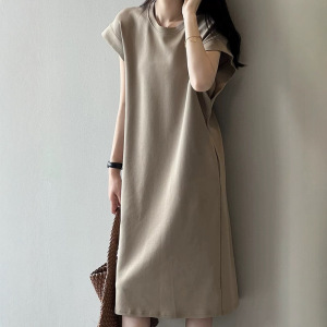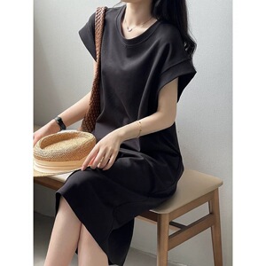 日本と韓国のカジュアル夏大きいサイズフライングスリーブドレスフレンチ露出防止ルーズニッチミッドレングスTシャツドレス女性用
