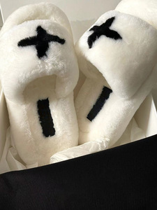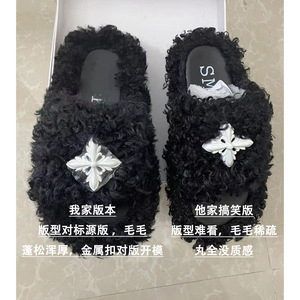 高品質! Wu Xuan Yi の同じスタイル SMFK クロスフラワーファースリッパブラックベルベット厚底アウターウェアスリッパ女性用