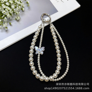 女款手机链创意ins时尚手机挂件diy手工珍珠水晶水钻双链挂绳新款