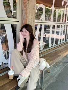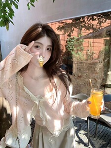 ソフトピーチグループピンクニットカーディガン春と秋の新しいレースサスペンダー女性の春と秋のデザイン気質