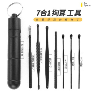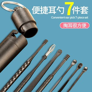 新しいオールブラックイヤースクープセットスプリング双頭回転イヤースクープ7ピース耳クリーナー耳かきツール