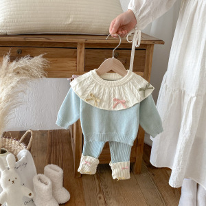 2025 秋冬新スタイル幼児ニットスーツ女の赤ちゃん人形襟リボントップレギンス 2 点セット