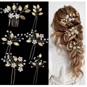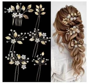 欧美2025跨境新款金色叶子珍珠发簪组合套装新娘婚礼手工发饰套装