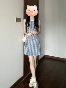 女性のための小さなノースリーブチェック柄ベストドレス夏のウエスト痩身フレンチスタイルレースアップAラインショートスカート