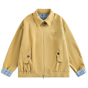 美式复古撞色格子拼接假两件外套男春秋季巴恩风灯芯绒夹克上衣潮