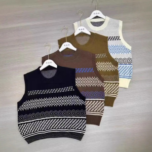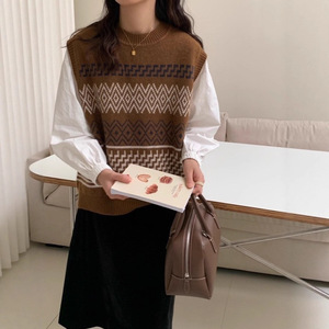 秋款圆领宽松休闲显瘦撞色提花套头无袖针织马甲背心女叠穿