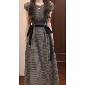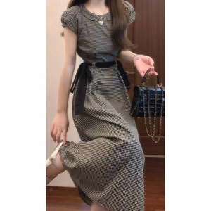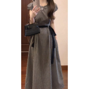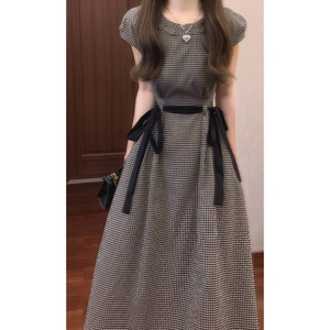 锦倩法式复古经典黑白格子连衣裙泡泡袖抽绳收腰显瘦气质长裙圆领
