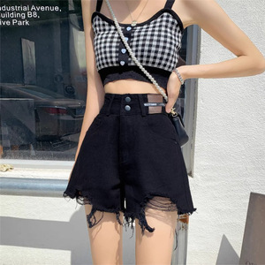 ブラックリップドワイドレッグデニムショートパンツ女性のための夏の2025新しい大きいサイズハイウエストAラインローエッジホットパンツイントレンド