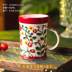 海棠杯子家用马克杯带盖复古陶瓷茶杯精致水杯办公室早餐杯情侣杯
