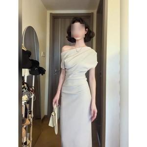 不规则收腰气质包臀褶皱连衣裙子女装夏季荡领斜肩露肩气质中长款
