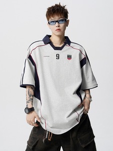 跨境泽西球衣T恤男美式撞色复古运动风机车短袖cleanfit夏季上衣