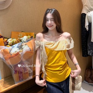 夏季新款纯欲风别致一字肩格子撞色收腰显瘦短袖上衣女装夏季