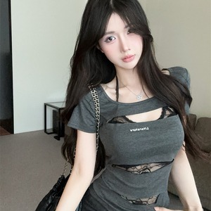 南理香星野漫步%假两件正肩短袖蕾丝挂脖辣妹T恤女夏收腰显瘦上衣