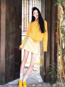 レイジースタイルイエローツイストニットカーディガン春と秋の新しい多用途ラウンドネックセーター気質スリムトップジャケット女性用