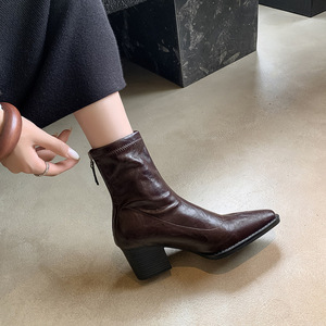 秋冬の女性用フレンチスタイルハイヒールショートブーツ、ベルベットストレッチブーツ、2025年新作女性用厚底ブーツ、ヌードブーツ、スリムブーツ