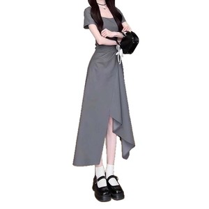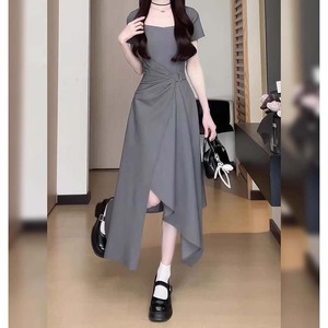 法式气质灰色连衣裙女夏季2025新款小个子绝美漂亮掐腰巨好看长裙