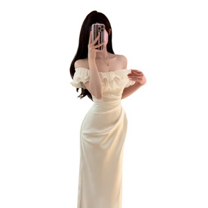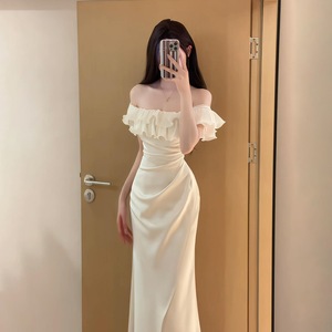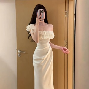 法式白色一字肩荷叶边连衣裙子女夏季纯欲风气质收腰包臀鱼尾长裙
