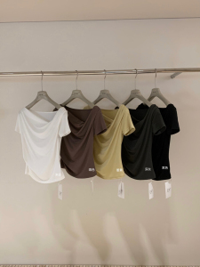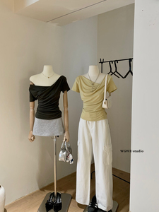 WGWE 夏レディース韓国風スウィートガール優しいスタイル万能ウエスタンスタイルスリムプリーツ斜め肩スイングカラー半袖TシャツW6440