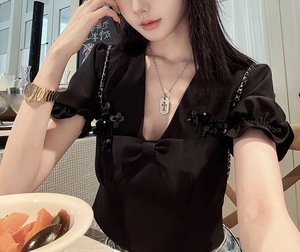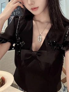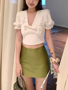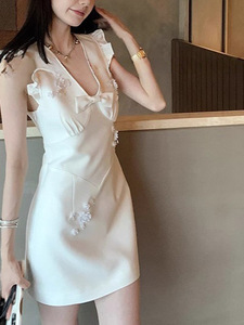欧阳家蝴蝶结连衣裙女夏季新款法式复古小个子短裙收腰显瘦裙子