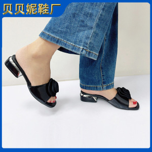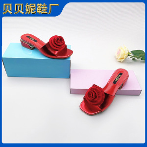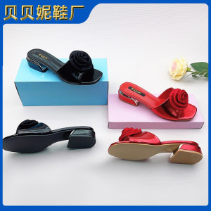 国境を越えた売れ筋のローズ装飾スクエアトゥミッドヒールスリッパ、カジュアルで快適なローヒールの女性用シューズ、女性用オープントゥサンダル