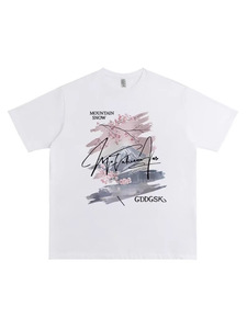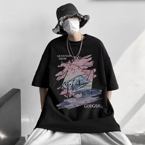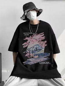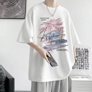 香港スタイルの夏の純綿厚手の半袖Tシャツ、パーソナライズされたプリント、トレンディなメンズカジュアル、多用途、ラウンドネック、ルーズ、多用途、半袖